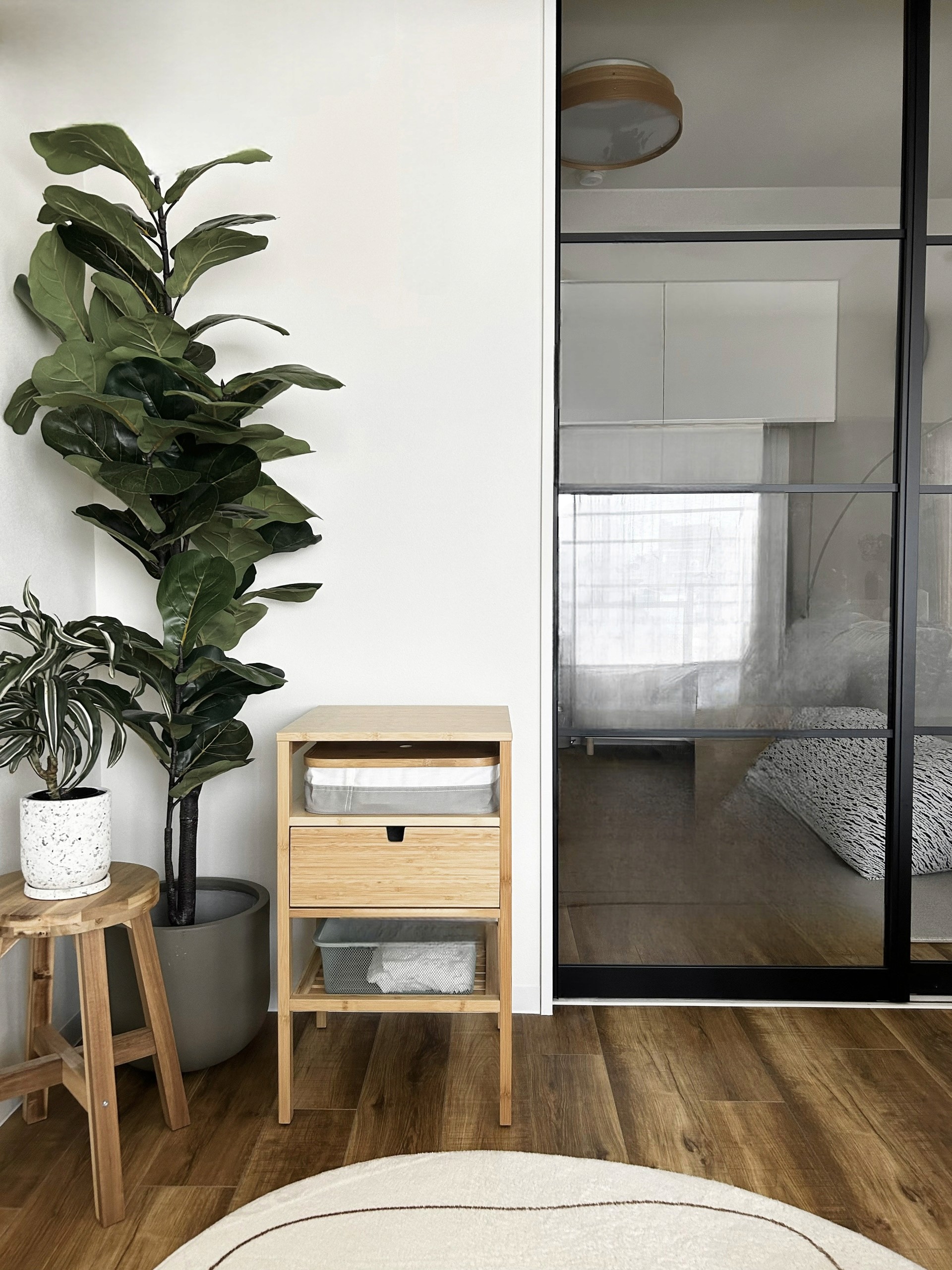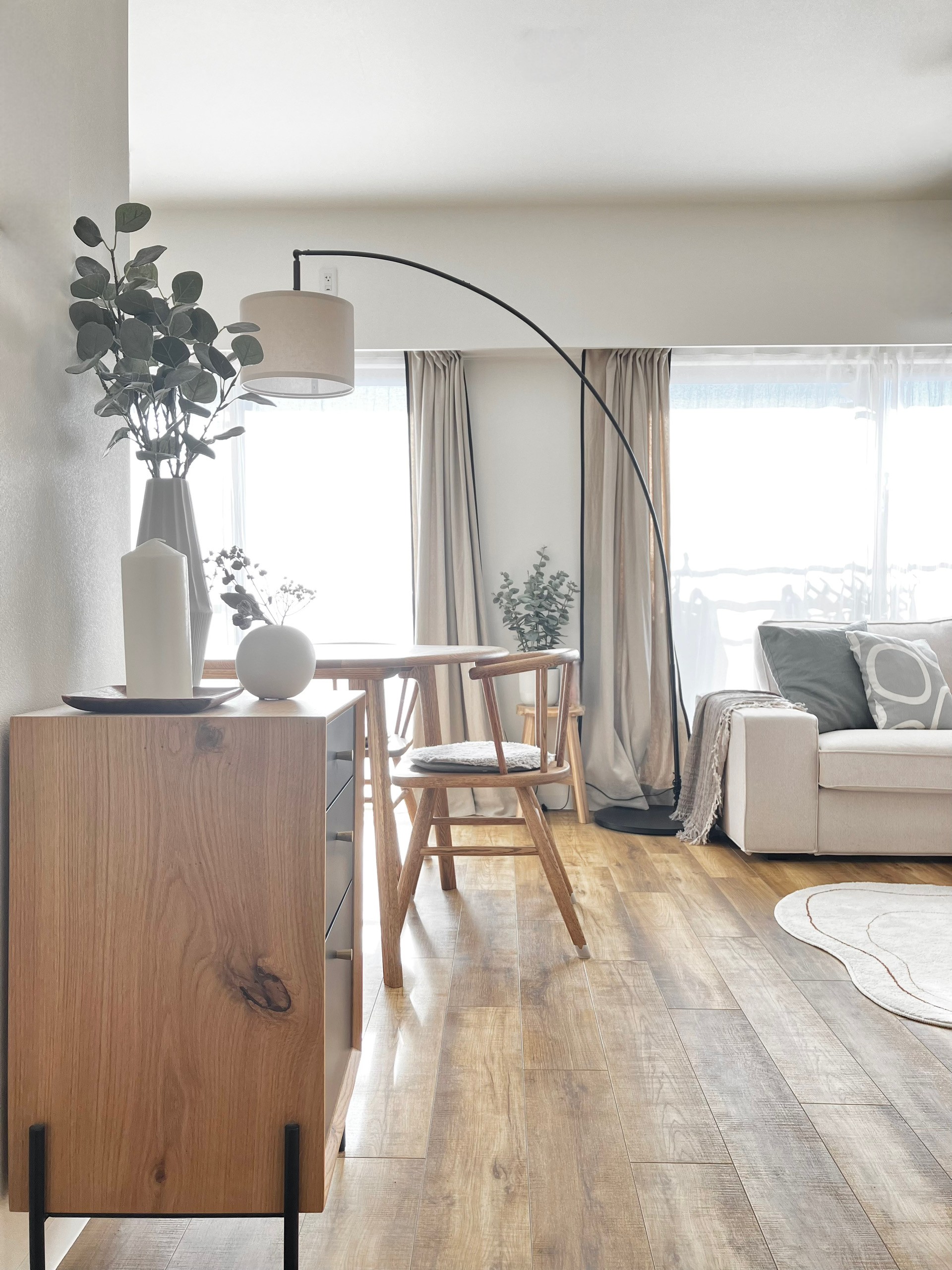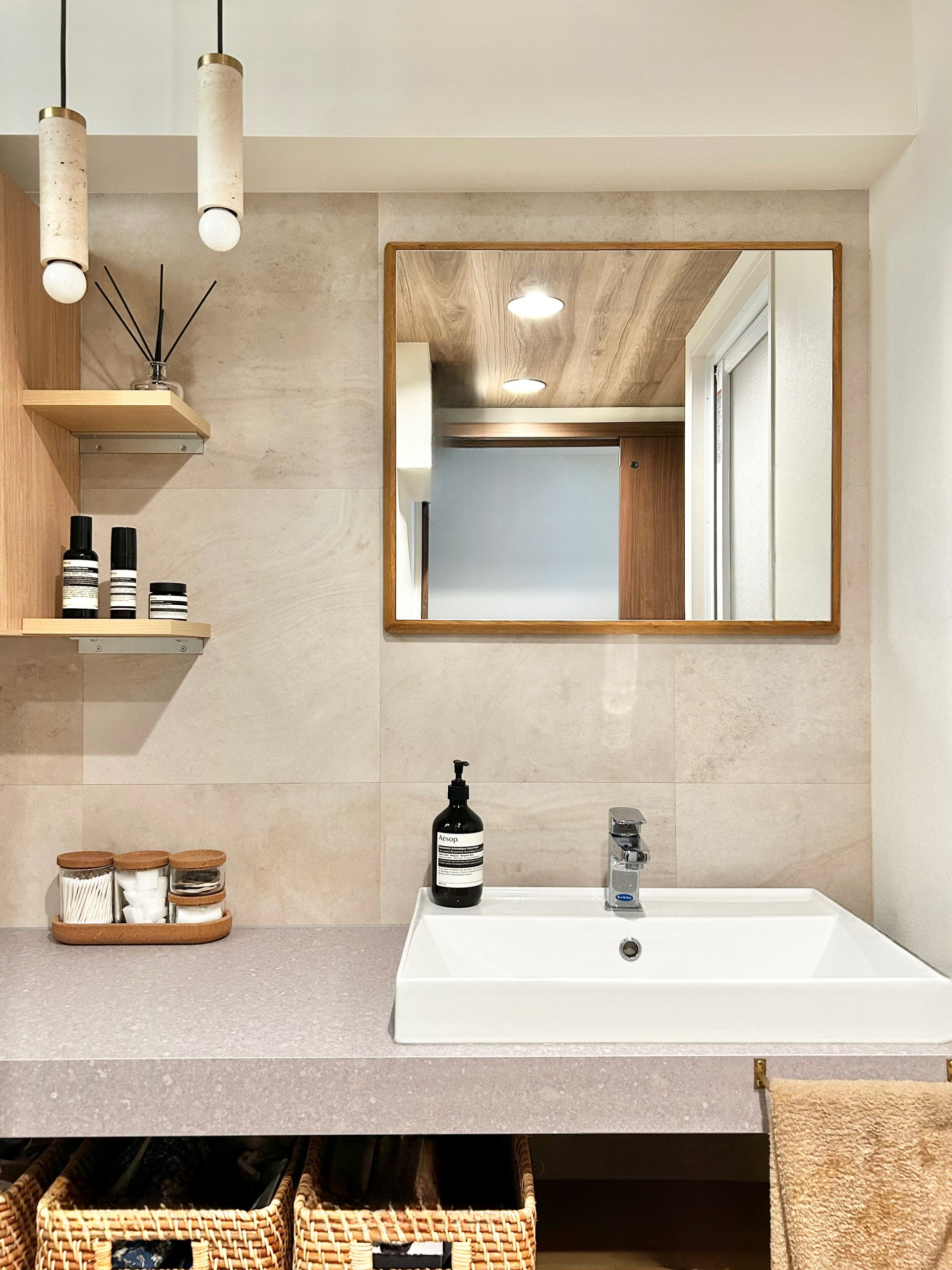 そこで、無駄をそぎ落としたミニマルなデザインをベースにしながらも、木の質感ややわらかな色合いを取り入れ、温もりを感じられる空間に。冷たくなりがちなミニマルデザインに、家族の暮らしに寄り添うあたたかさをプラスしました。