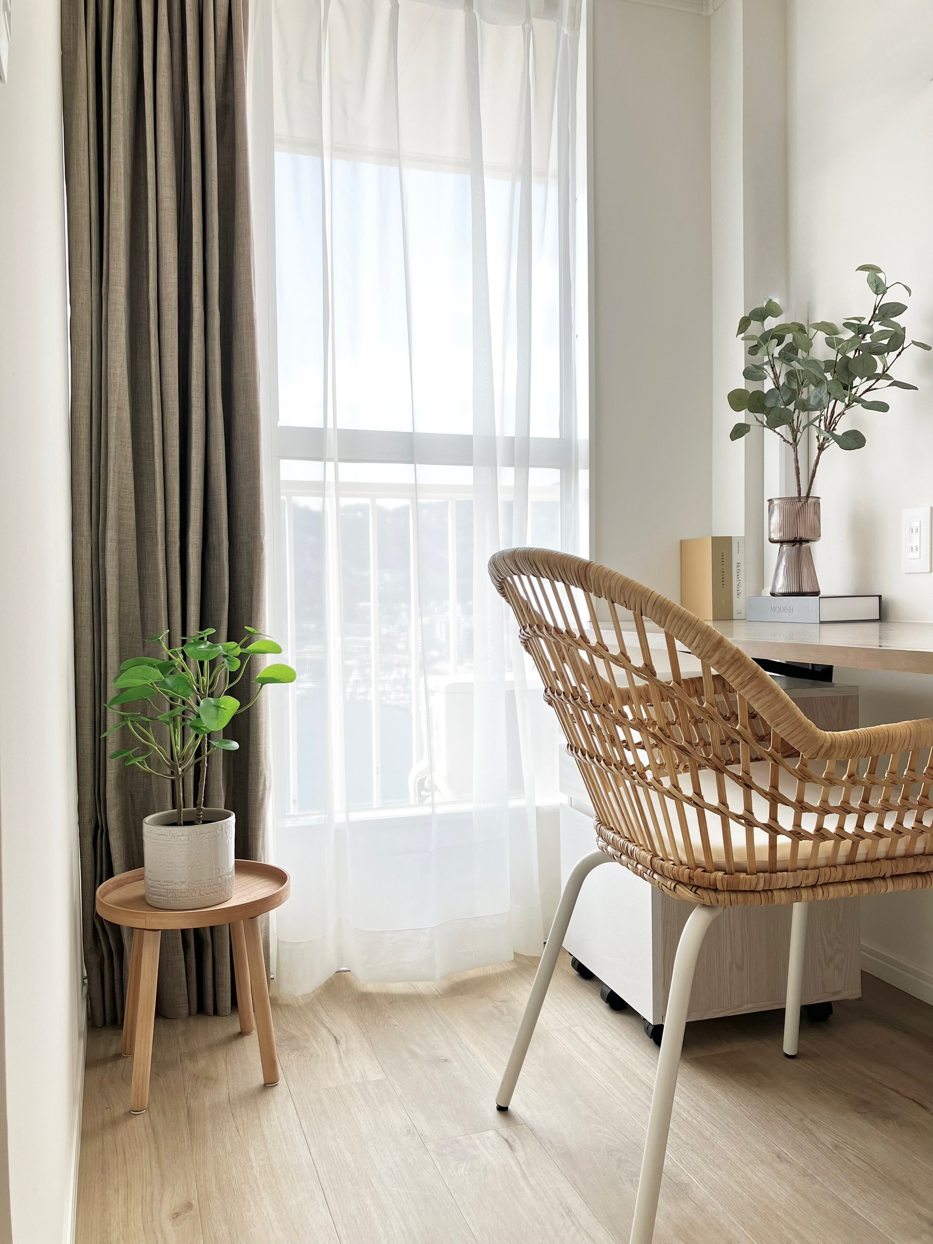 眺望の良い窓際にはテレワークや趣味に使えるコワーキングスペースを設け、日常と非日常を切り替えながら過ごせる環境に。空間全体はやわらかなベージュトーンでまとめ、落ち着きと洗練を兼ね備えた雰囲気に仕上げました。